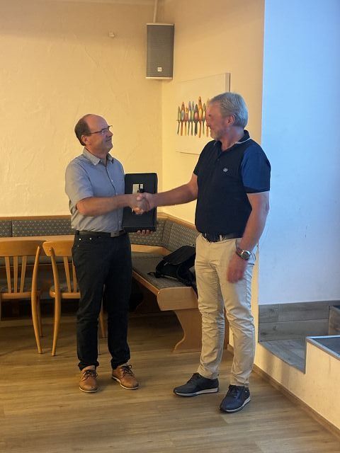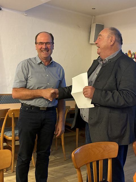 Anton Mandl dankte dem ausgeschieden Vorstandsmitglied Johann Pfaffinger für die vielen Jahre sein Engagements in der Vorstandschaft mit einem kleinen Geschenk