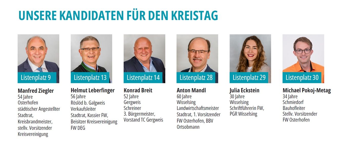 Die Kreistagskandidaten der Freien Wähler Osterhofen auf der Kreistagsliste der Freien Wähler im Landkreis Deggendorf