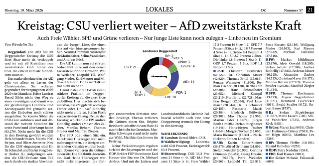 Die Freien Wähler der Kreisvereinigung Deggendorf konnten 528.939 (17,3%) erzielen und konnten 10 Kreistagsplätze (Kreistagsplätze in Summe: 60 Plätze) gewinnen.