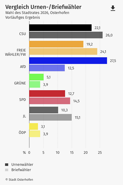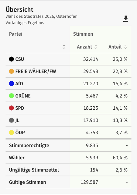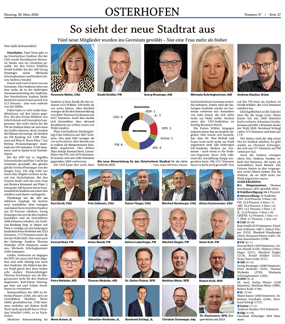 Die Freien Wähler Osterhofen konnten 29.548 Stimmen (22,8%) erzielen und erhalten somit 6 Stadtratsplätze (Stadtratsplätze in Summe: 24 Plätze).