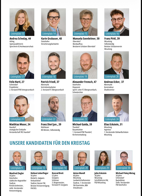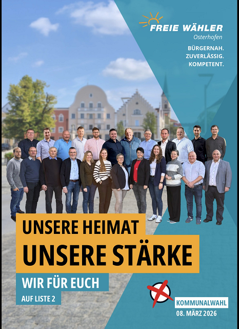 Der Wahlflyer der Freien Wähler Osterhofen mit den 24 Kandidaten zur Stadtratswahl am 8. März 2026 und die 6 Kandidaten zur Kreistagswahl, jeweils auf Liste 2