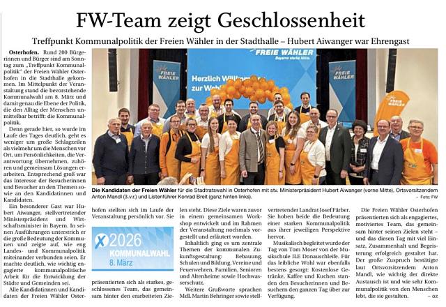 Der Stellv. Ministerpräsident, Herr Hubert Aiwanger war einer der Gastredner, sowie MdL Martin Behringer und natürlich die Kandidaten der Freien Wähler Osterhofen.