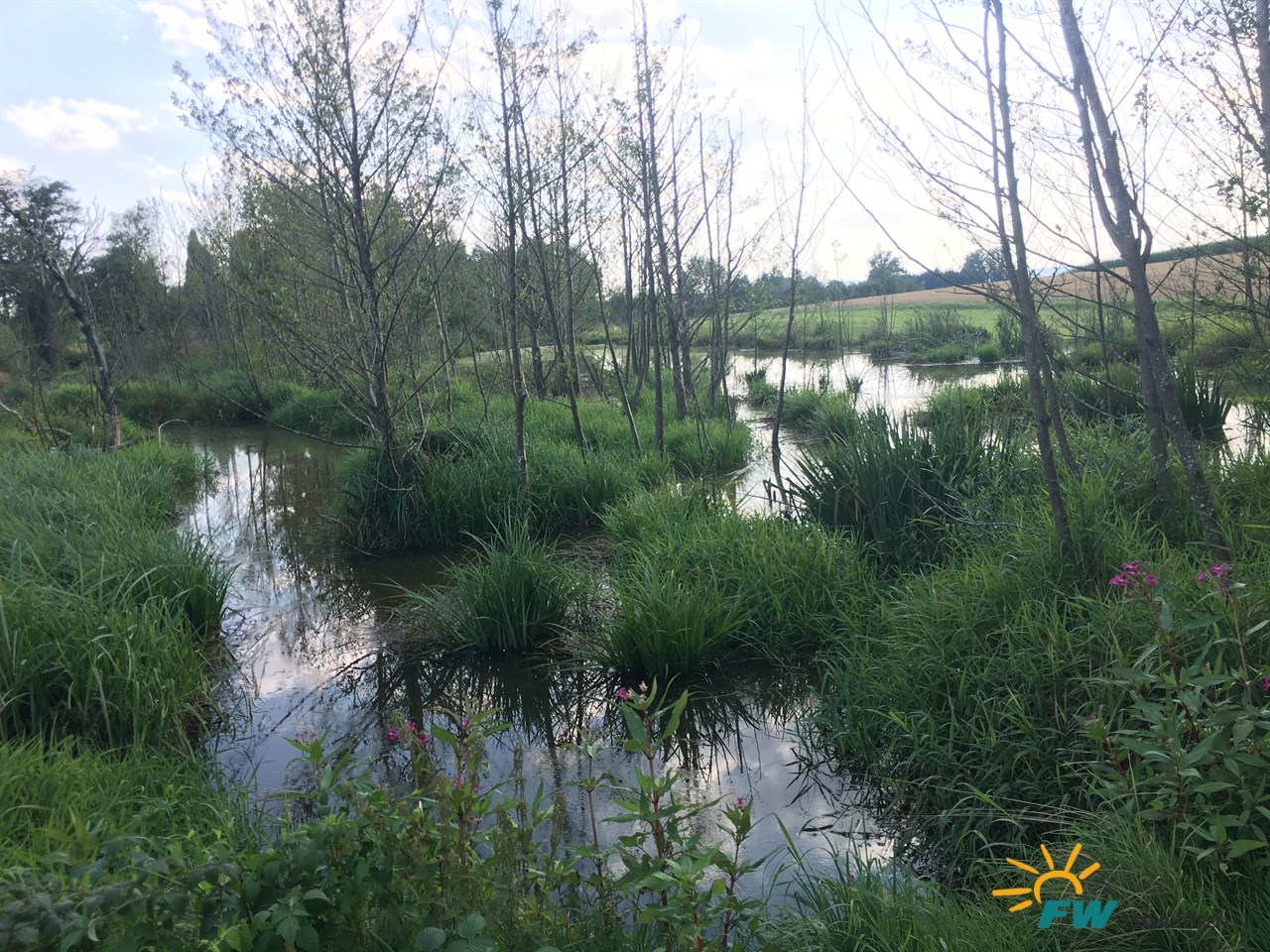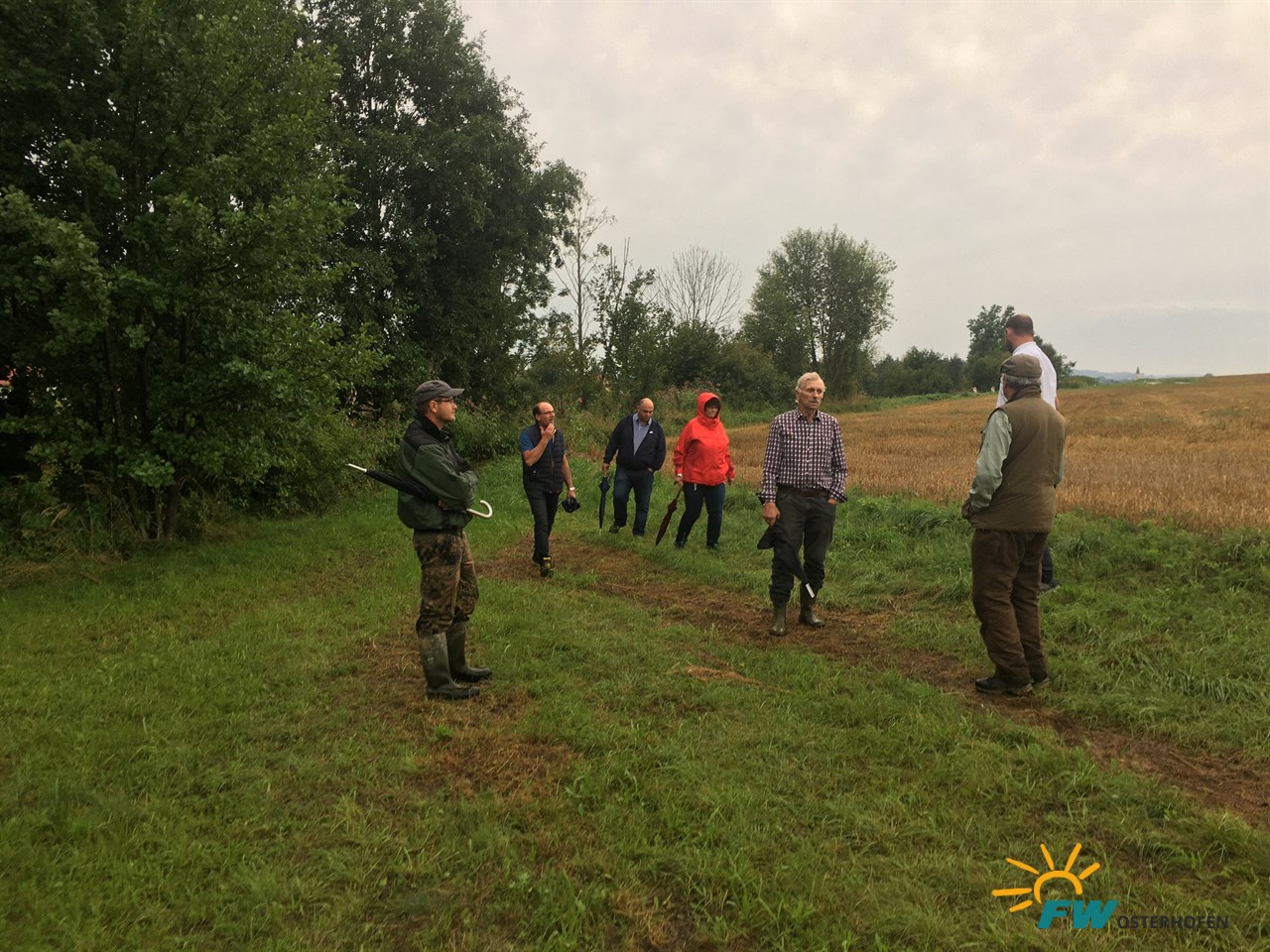 Ein gesundes Miteinander zwischen Mensch und Biber müsse in den kommenden Monaten und Jahren entstehen, aber jeder in seinem Lebensbereich. Mit den Bibern darf nicht das Hochwasserkonzept von Oberndorf gefährdet werden, natürlich müsse man für den Biber auch Freiräume schaffen und erhalten. In den Rückstaubecken sind an einigen Stellen Ablaufrohre installiert, damit man den Wasserspiegel auf einem verträglichen Niveau halten kann. Die Ablaufrohre, welche vor dem Biber mit einem Drahtgitter geschützt werden, sollten regelmäßig von Holz und Schmutz befreit werden, damit die Wasserhöhe und die Funktion des Ablaufes auch gewährleistet werden kann und dieses müsste Vorort durch freiwillige Helfer überprüft werden. In den kommenden Jahren muss in Oberndorf auch versucht werden, weitere Retentionsräume für die Hochwassersituationen zu schaffen, damit bei Regenmengen wie in diesem Juni, dass Wasser sich vor Oberndorf in der Fläche ausbreiten kann und dann erst nach einem Zeitversatz ab fliesen könne. Die somit neu entstehenden Räume und Flächen für das Wasser und natürlich auch die die Natur, könnten durch den kommunalen Landschaftspflegeverband betreut und biologisch aufgewertet werden. Mit diesem Lösungsansatz könnte man in Oberndorf erheblich zum Hochwasserschutz beitragen und gleichzeitig würde man der Natur neue Lebensräume zur Regeneration anbieten. Zum Abschluss des Rundganges dankte Franz-Xaver Eckl den beiden Gästen für die vielen Infos und Lösungsansätze, was alles in Oberndorf und um das Dorf in den kommenden Monaten und Jahren aktiv angegangen werden könnte.