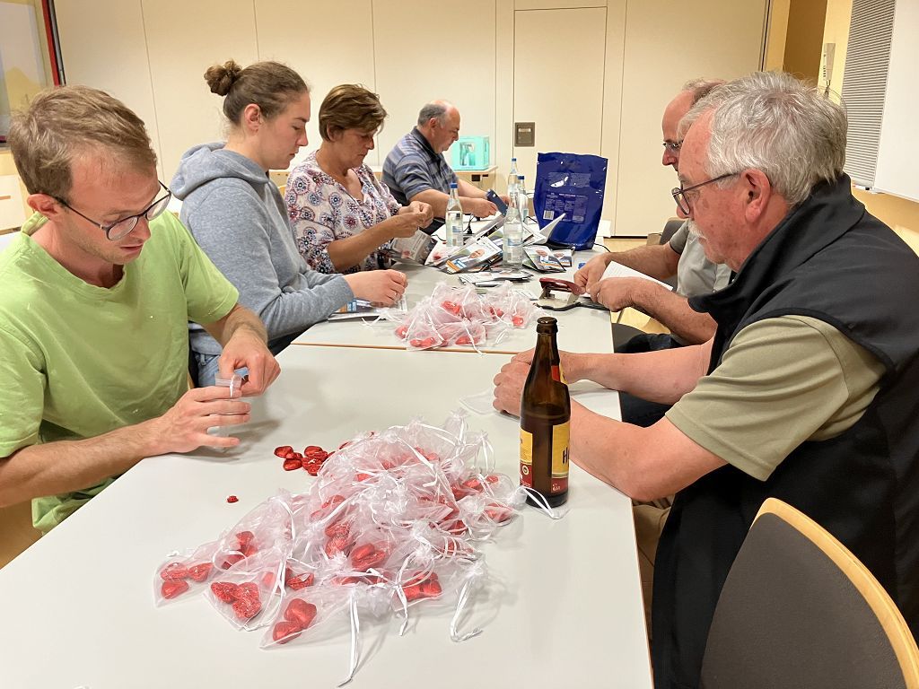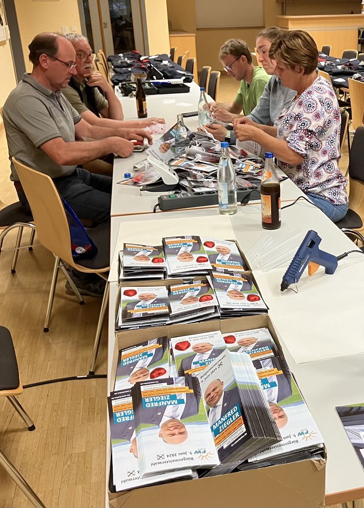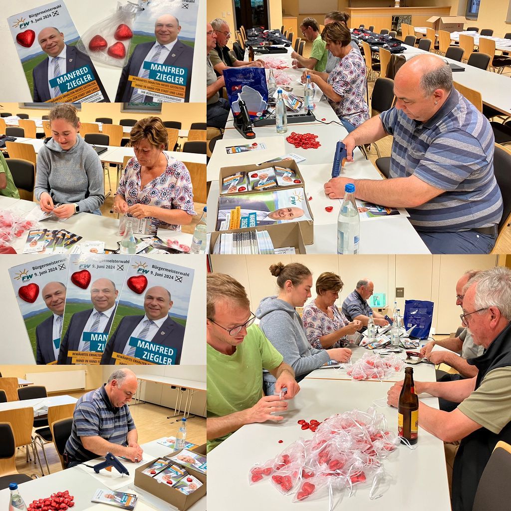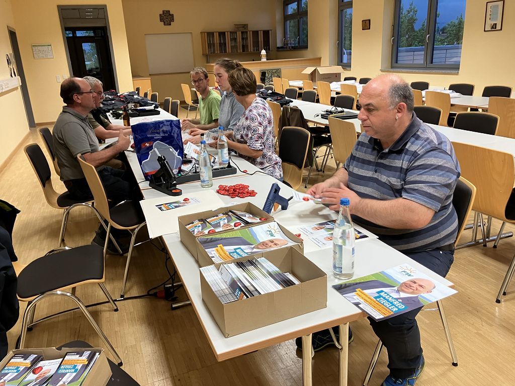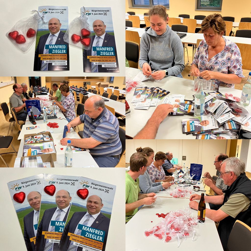 Die "fleißigen Bienen" der Freien Wähler Osterhofen gestalten die Wahlflyer für den Infostand am Stadtplatz, einen Tag vor dem Muttertag.