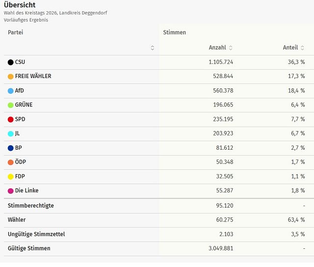 Die Freien Wähler der Kreisvereinigung Deggendorf konnten 528.939 (17,3%) erzielen und konnten 10 Kreistagsplätze (Kreistagsplätze in Summe: 60 Plätze) gewinnen.