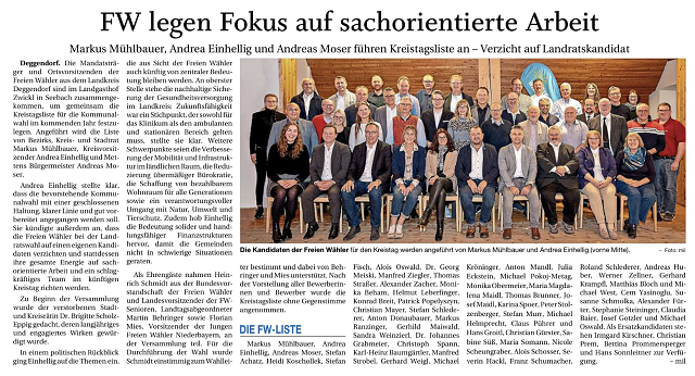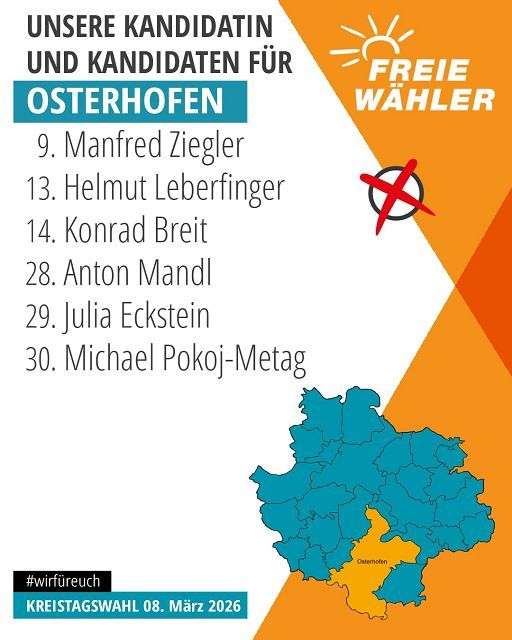 Auch der Ortsverband der Freien Wähler Osterhofen ist mit 6 Kandidaten auf der Kreistagsliste der Freien Wähler (Liste 2) vertreten und kämpft um Plätze im Kreistag.