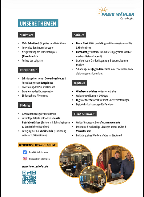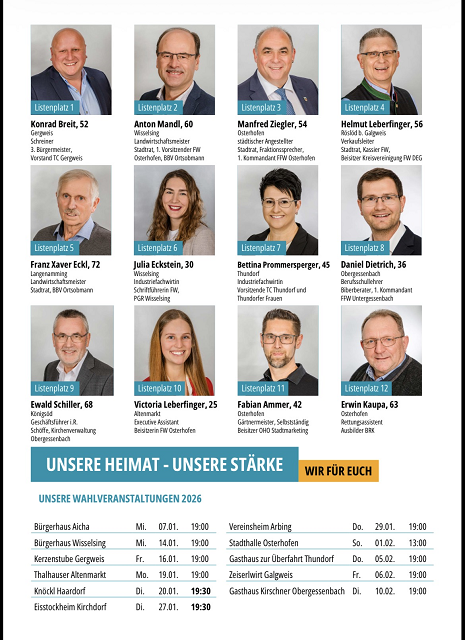 Der Wahlflyer der Freien Wähler Osterhofen mit den 24 Kandidaten zur Stadtratswahl am 8. März 2026 und die 6 Kandidaten zur Kreistagswahl, jeweils auf Liste 2