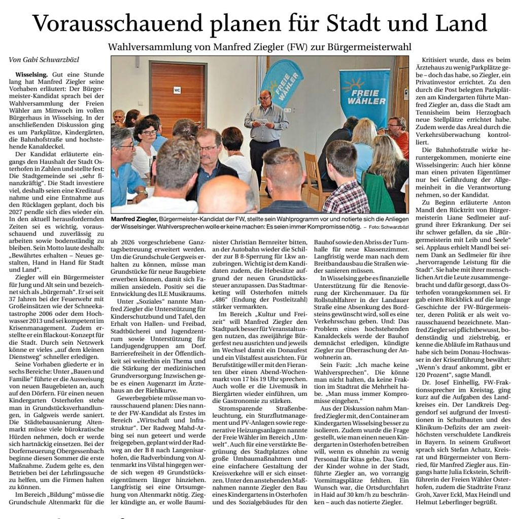 An diesem Mittwoch konnten die Freien Wähler Osterhofen Ihren Bürgermeisterkandidaten Manfred Ziegler im Bürgerhaus Wisselsing vorstellen.